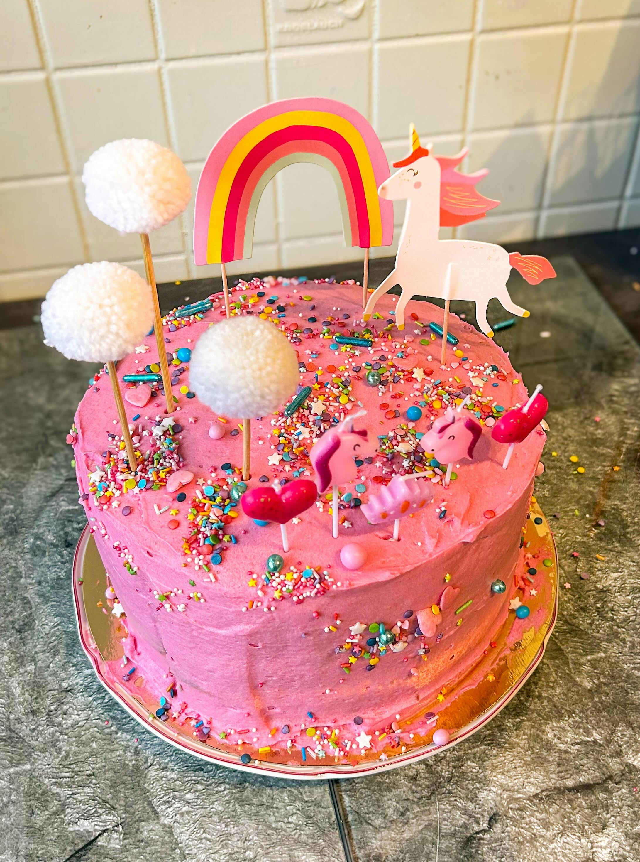 Unsere Einhorn Torte ist rosa, voller bunten Streuseln, hat einen Regenbogen, Pompom Wolken und ein fröhlich dahin hüpfendes Einhorn. Gleichzeitig ist sie null kitschig, kommt ganz ohne Fondant aus und schmeckt einfach unglaublich lecker.