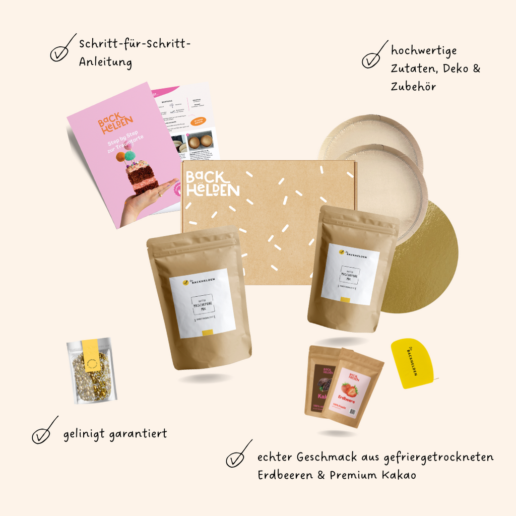 Ich liebe die Tortenkit von diebackhelden, bin der größte Fan.Es ist alles dabei was man braucht zum backen und dekorieren.