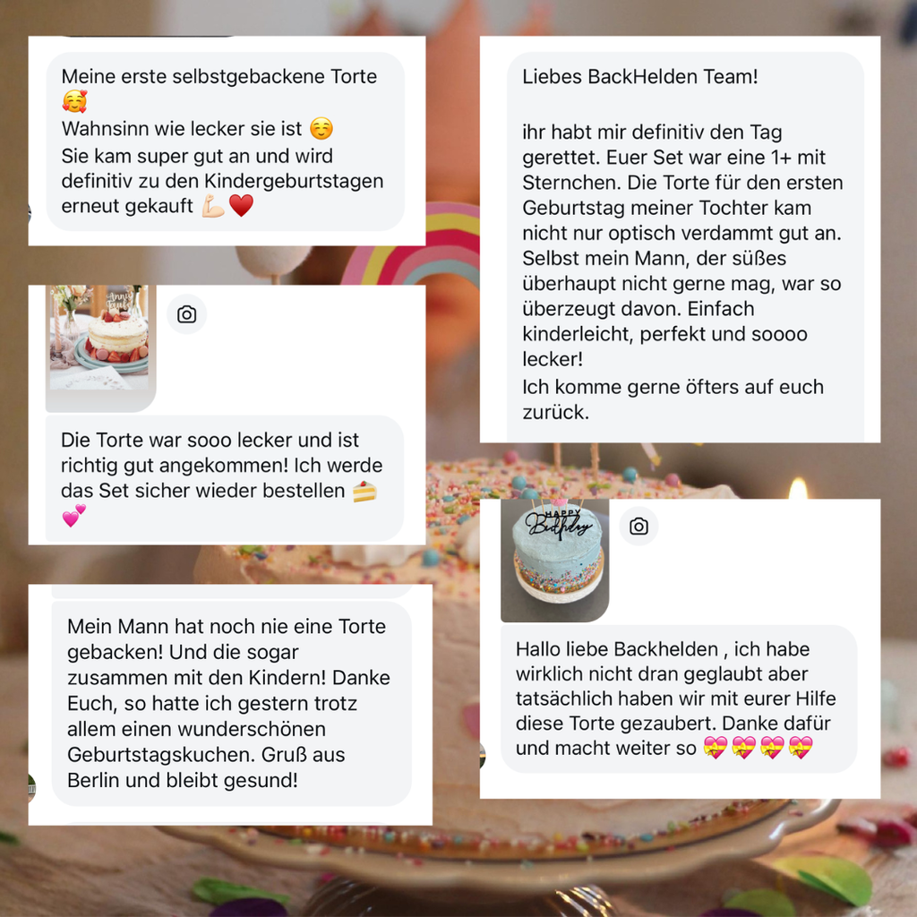 Ich liebe die Tortenkit von diebackhelden, bin der größte Fan.Es ist alles dabei was man braucht zum backen und dekorieren.