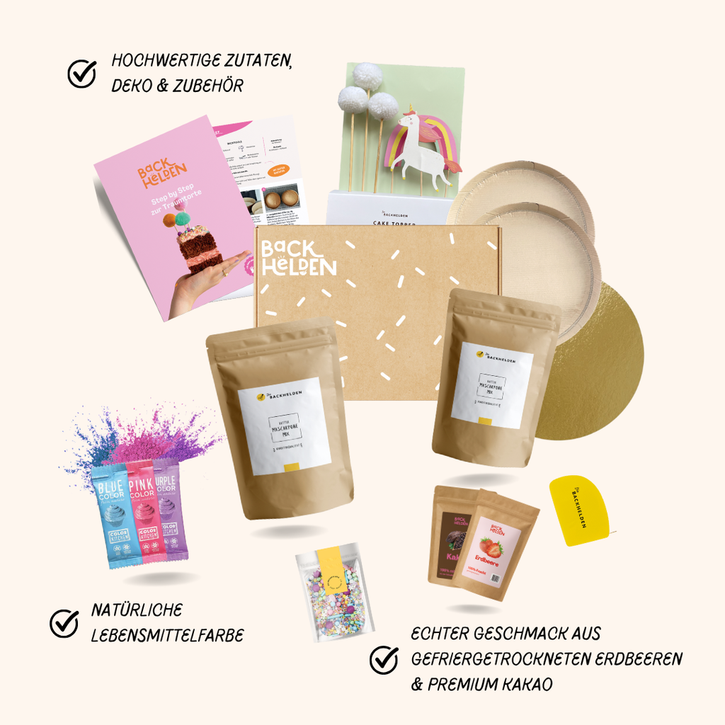 Ich liebe die Tortenkit von diebackhelden, bin der größte Fan.Es ist alles dabei was man braucht zum backen und dekorieren.