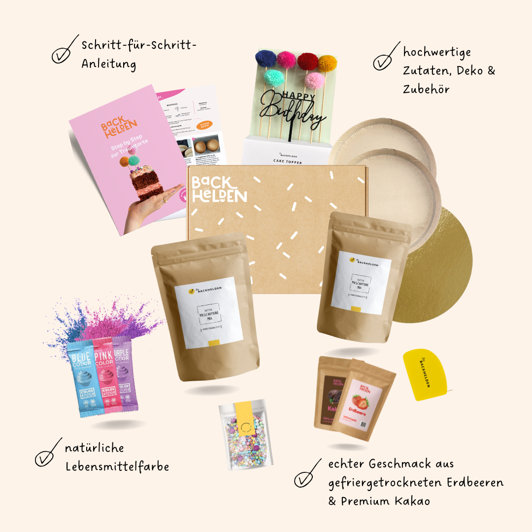 Mit unserem Tortenkit zauberst du ganz einfach eine atemberaubende Torte, die aussieht wie vom Profi und das ohne Stress. Du bekommst alle haltbaren Zutaten und Deko-Elemente in bester Qualität.